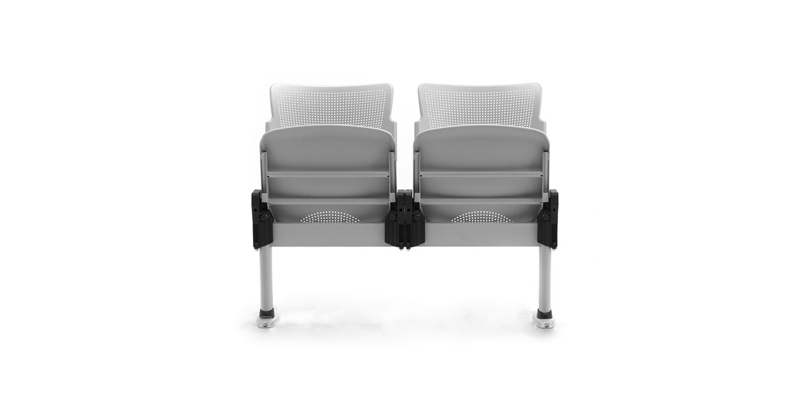 Die Sitzbank kann mit einem festen oder kippbaren Antipanik-Tisch in schwarzer, weißer, aluminiumgrauer oder verchromter Ausführung ausgestattet werden. Die Sitze sind feststehend oder kippbar und mit einer Rückholfeder ausgestattet, die so kalibriert ist, dass sie die Geräusche während der Schließphase reduziert. Die Sitze sind aus transparent lackiertem Buchensperrholz, perforiertem Polypropylen, lackiertem Stahl oder gepolstert und mit recyceltem und recycelbarem feuerhemmendem Stoff, Öko-Leder, Leder oder Wolle mit einer Martindale-Abriebfestigkeit von bis zu über 200.000 Zyklen bezogen erhältlich.